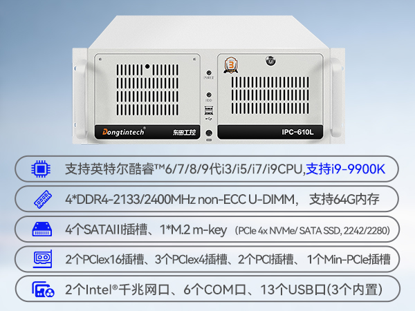 東田工控DT-610L-BQ270MA是一款4U機(jī)架式工控機(jī),采用酷睿9代i99900k處理器,擁有5個PCIe插槽,至多可擴(kuò)展20個網(wǎng)口。支持多種操作系統(tǒng)。內(nèi)存4*DDR4至高64G。內(nèi)存巨大,使用快速流暢,支持定制。